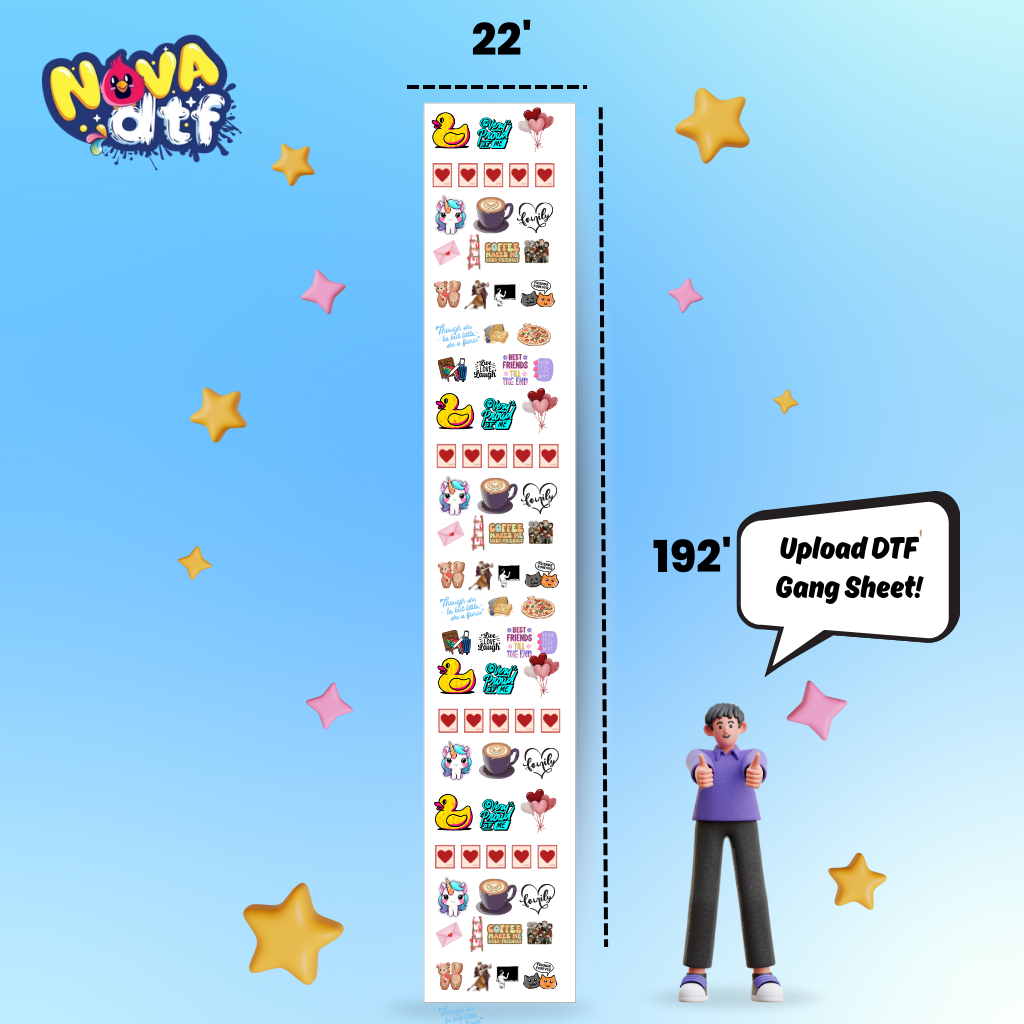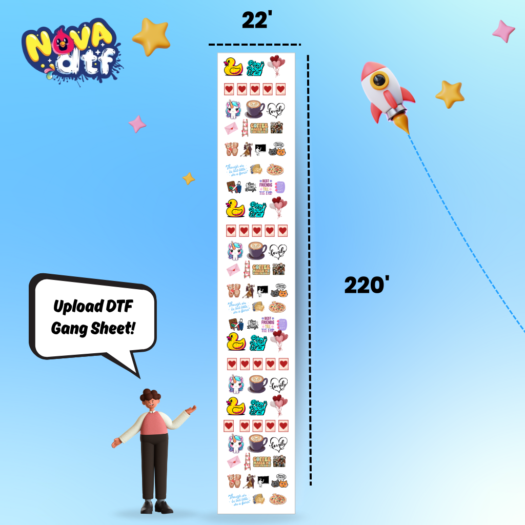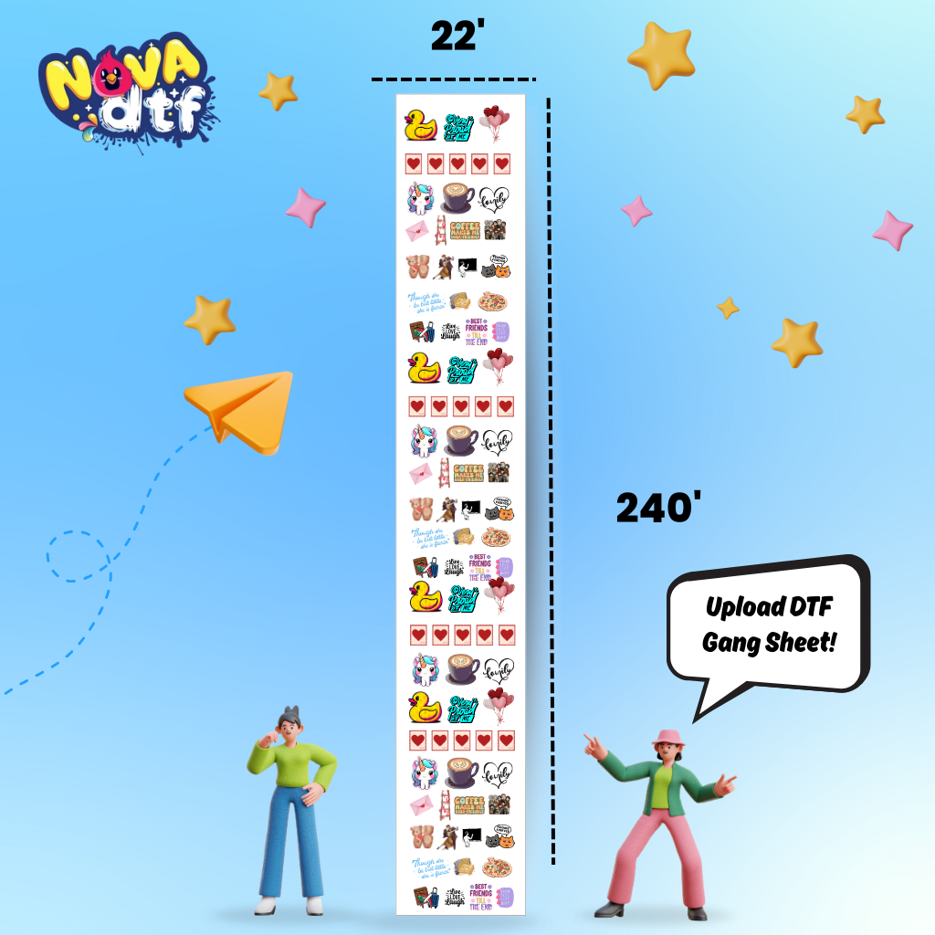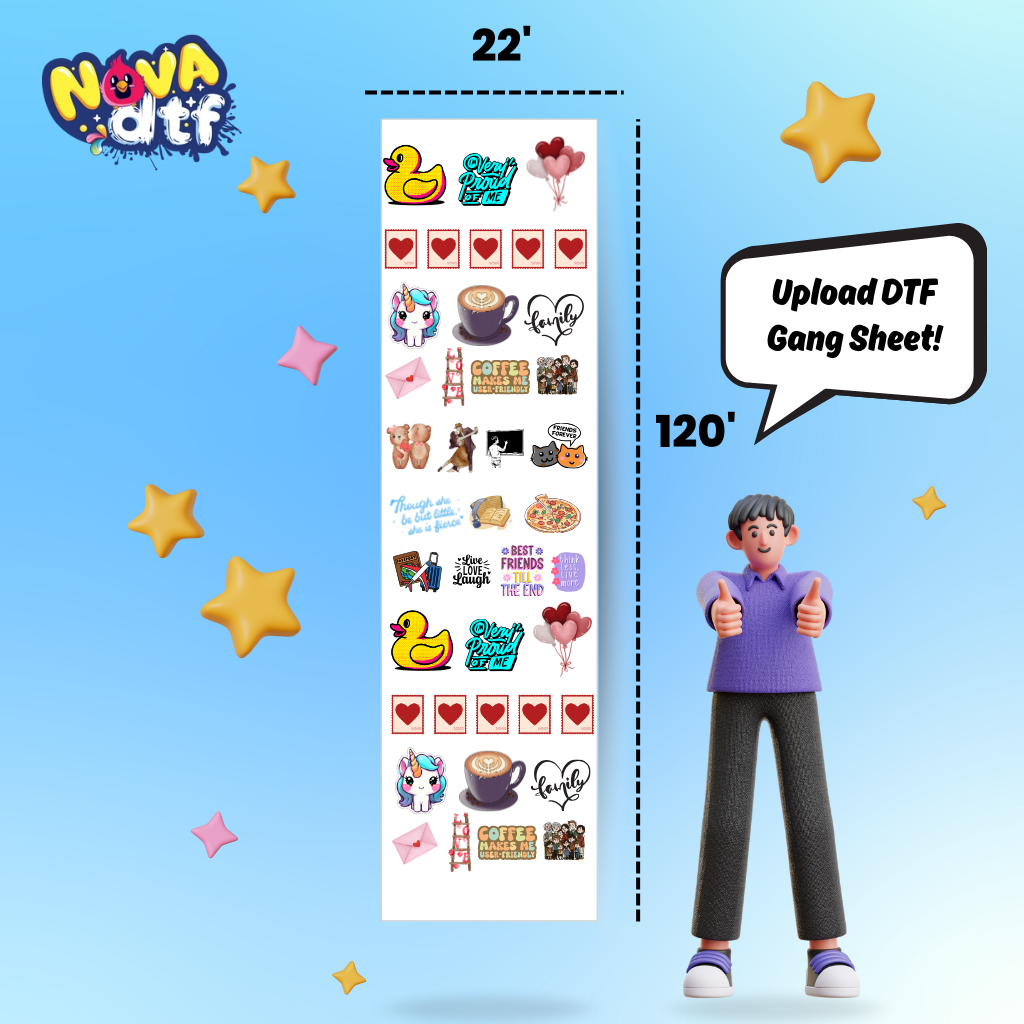 Print your designs with unmatched vibrancy and durability using Nova DTF’s custom gang sheets. Perfect for apparel brands, small businesses, and crafters, our professional DTF transfer sheets work on cotton, polyester, blends, and all fabric colors.