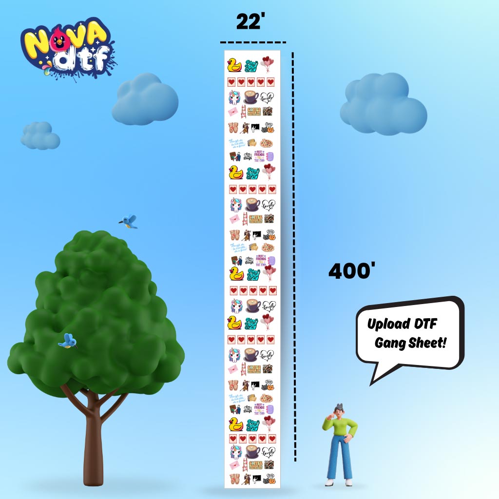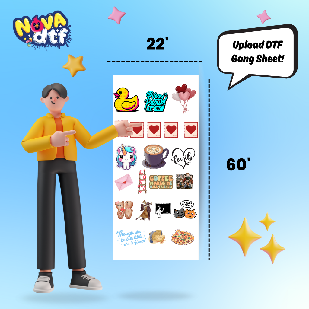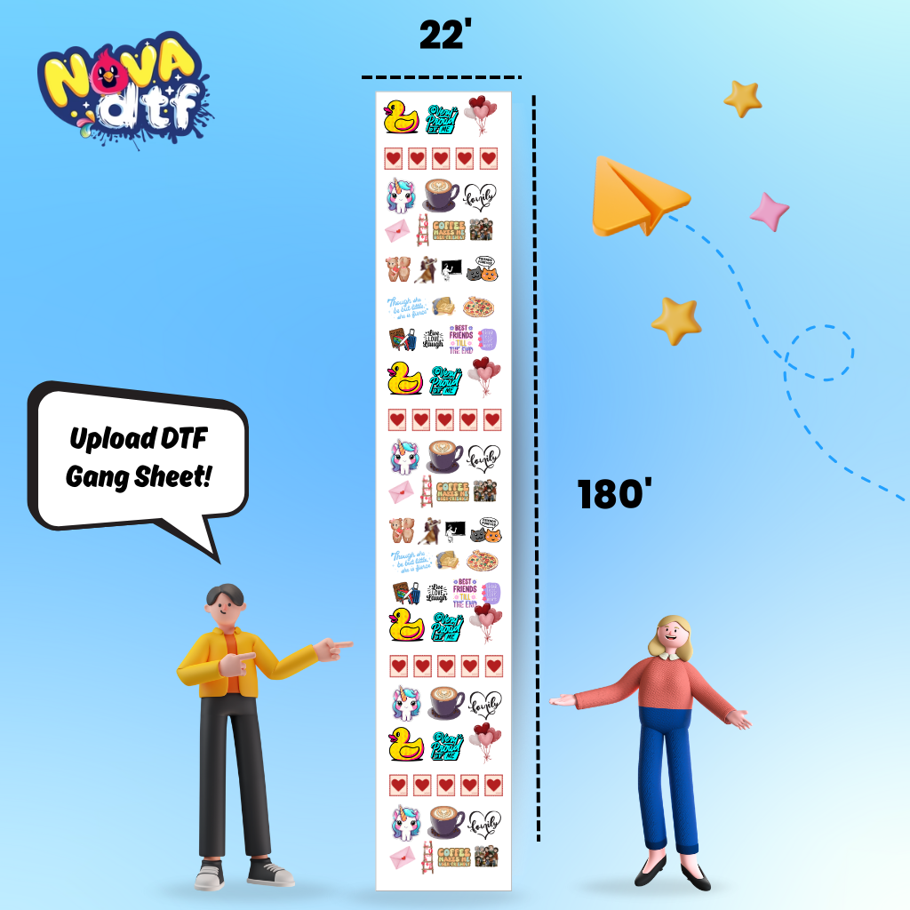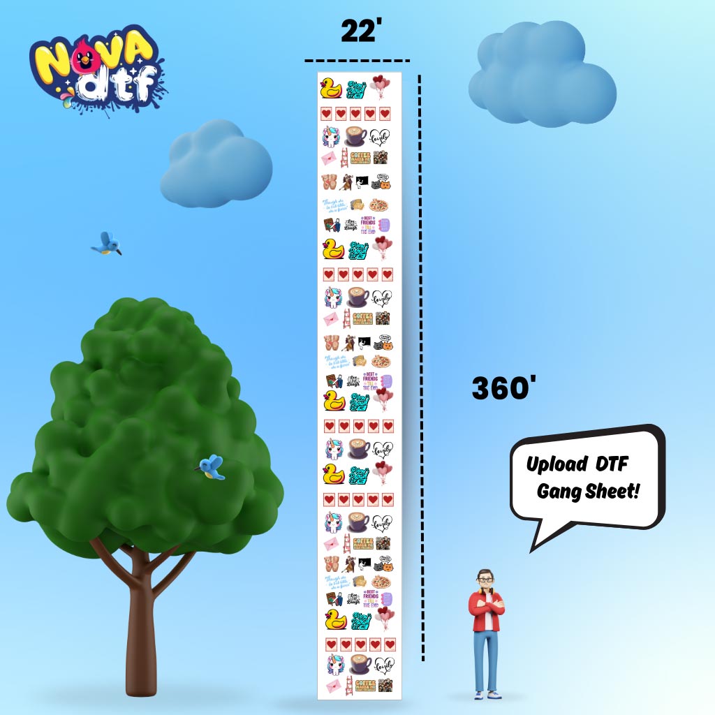 Print your designs with unmatched vibrancy and durability using Nova DTF’s custom gang sheets. Perfect for apparel brands, small businesses, and crafters, our professional DTF transfer sheets work on cotton, polyester, blends, and all fabric colors.