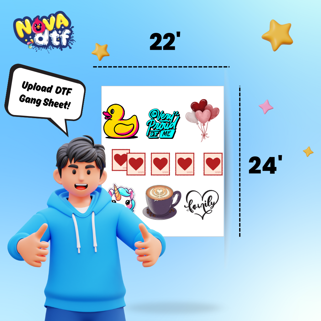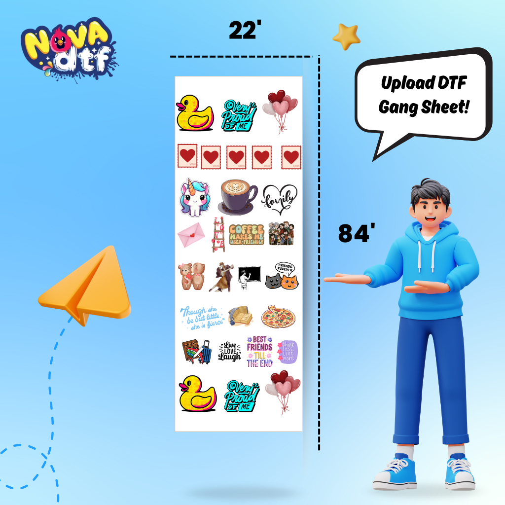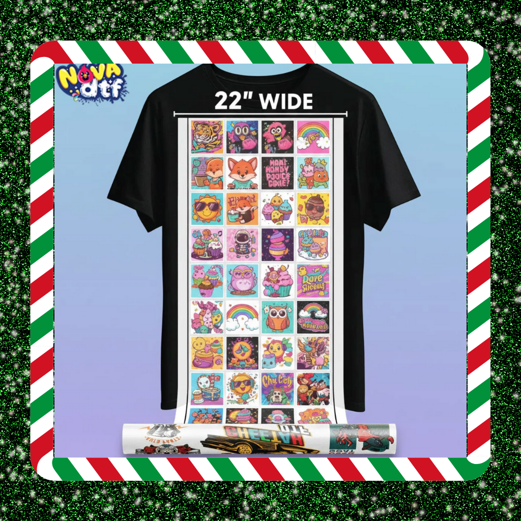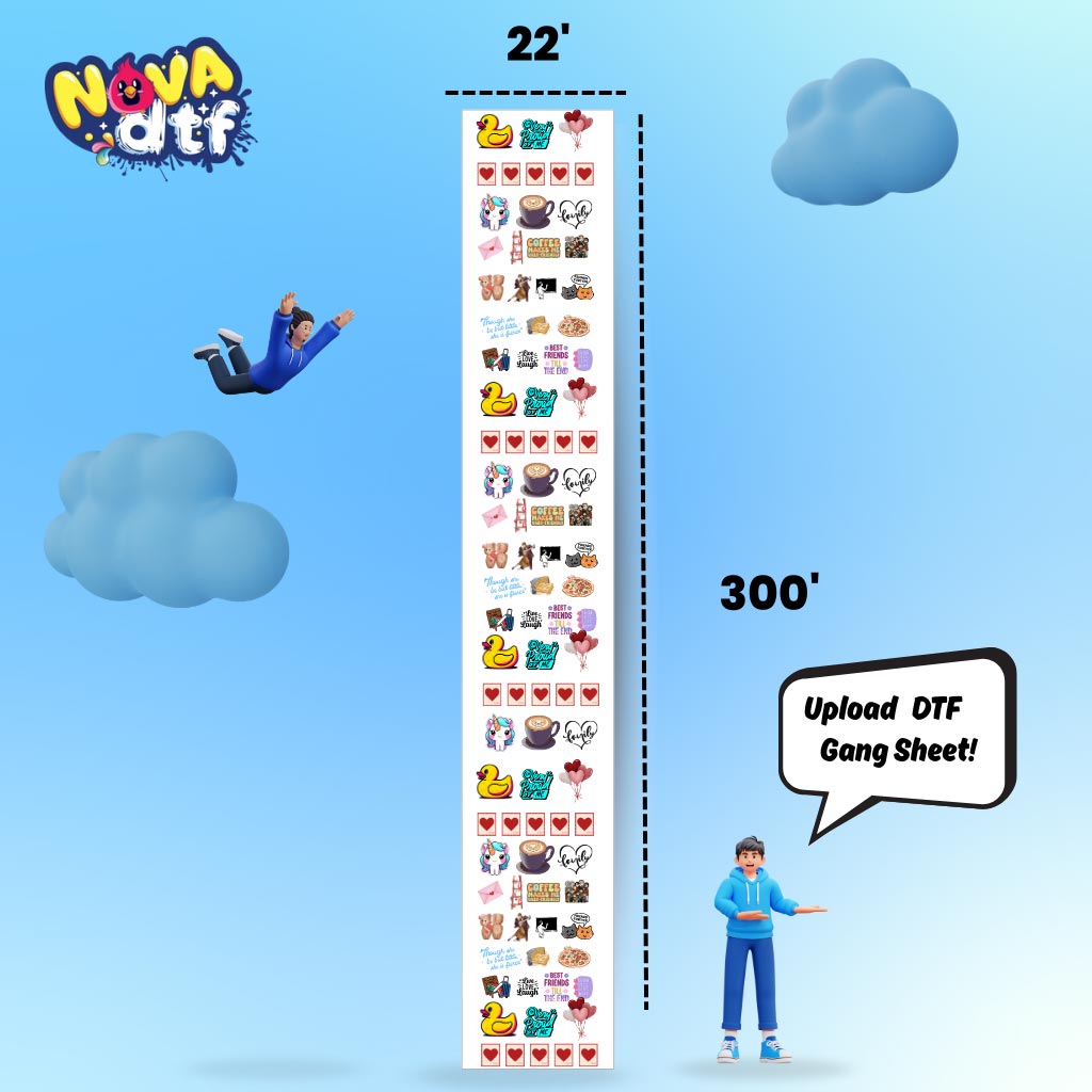 Print your designs with unmatched vibrancy and durability using Nova DTF’s custom gang sheets. Perfect for apparel brands, small businesses, and crafters, our professional DTF transfer sheets work on cotton, polyester, blends, and all fabric colors.